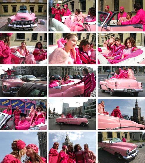 Maurycy Gomulicki, “KING SPRING” – video: 3’46” / camera: Rodrigo Espinosa / fotostills: Rafał Nowak, Albert Zawada / edition: Ilian Gonzalez / zarape suit: Maurycy Gomulicki in collaboration with Carla Fernandez / Taller Flora / knitted outfit: Genoveva Alvarez for Pink not dead! / music: I’am so excited – Le Tigre / special thanks to: Muzeum Automobilizmu i Techniki, Mango Models (Ania, Ela, Ewa, Monika & Weronika) / the action took place in Warsaw on april 7th 2006 as a part of Maurycy Gomulicki project “Pink not dead!” in CCA Ujazdowski Castle, Warsaw/Mexico 2006