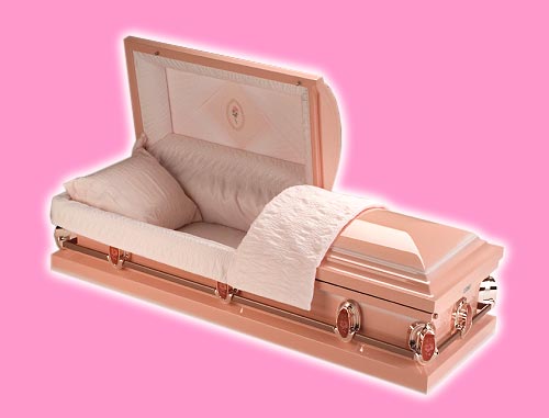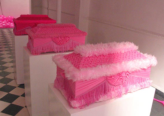 Ponieważ otwarłem wczoraj kolejną żałobną wystwę (Final Fantasy, Garash) Pomyślałem sobie, że to dobry pretekst do zrobienia małego przeglądu różowych trumien i innych pogrzebowych parafernalii. Na początek zdjęcie mojej pracy z PND! – “Pink Sorrow” – trzy trumienki dziecinne wykonane na zamówienie zanikającą już tradycyjną techniką przez zakład rodziny Jaramillo. Jest to swoisty pretekst do refleksji nad funkcjonalnością piękna a zarazem próba podsumowania oczywistych różowych fenomenów takich jak torty czy suknie ślubne w obrebie absurdalnie spolaryzownego perwersyjnego obiektu. Poniżej kilka przykładów różowych trumien dostępnych na rynku oraz link do