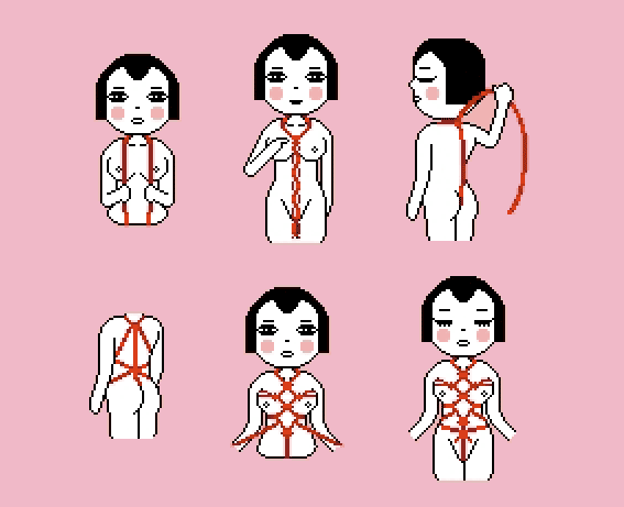 Pixel art as any aesthetic phenomena that appears in direct relation to technology is pretty much abandoning the main stream by now and finding itself in specific niche for fans. After its immense popularity and fantastic success of Eboy it is very rare now, in the 64 bit decade to find something fresh coming from the digital mosaic universe. Jovixu is a pixel designer from China. I was immediately enchanted with the few little drawings of her that I could see on flicker. I am happy to find someone who explores pleasure and perversion with such visual culture – fine lady of the pixel she is! Here two samples of pinkworks: above Shibari below Medical Fetish.