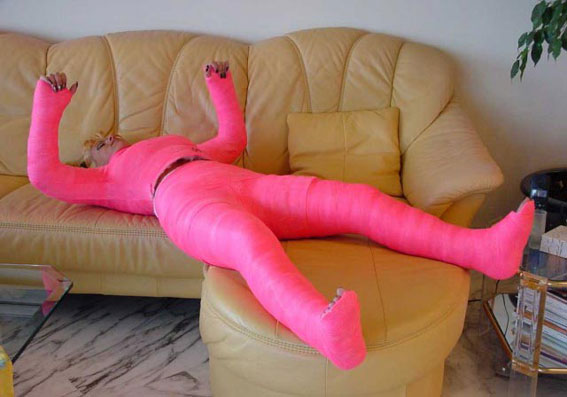Plaster fetish is sort of a fussion between bondage and medical fetish. Since color casts started to be common thing “The Radical Cast Scene” changed its pale look into a true rainbow. As Pink is at its Peak in Pop so it is also in here. I find colorful casts fun but sincerely the whole matter doesn’t turn me much on. Anyway again peculiar sample of “meta-sexual” phenomena that locates itself somewhere between performance and sculpture. Below links of several cast groups on flicker – plenty of pink in there.