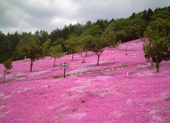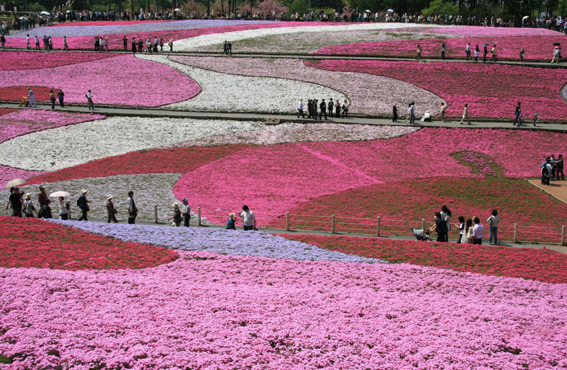 Hitsuji-yama Park, Chichibu, SAITAMA is a field of pink moss designed to make a pattern on the hill of hitsuji-yama, using more than 400,000 bulbs. This flower patchwork of pink, white and purple spreads over 16500 square meter and is truly overwhelming.