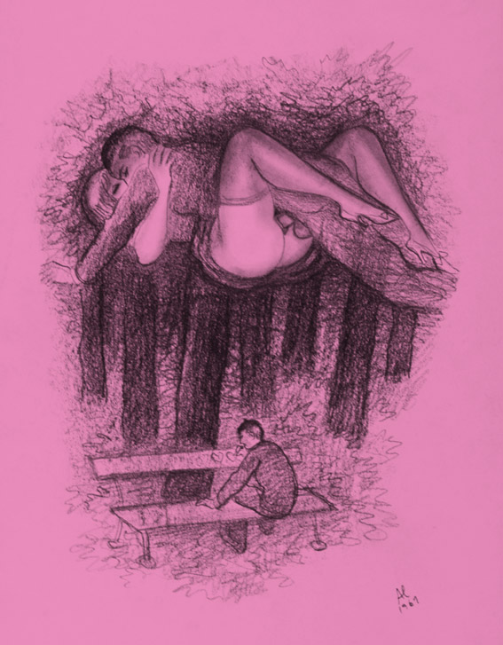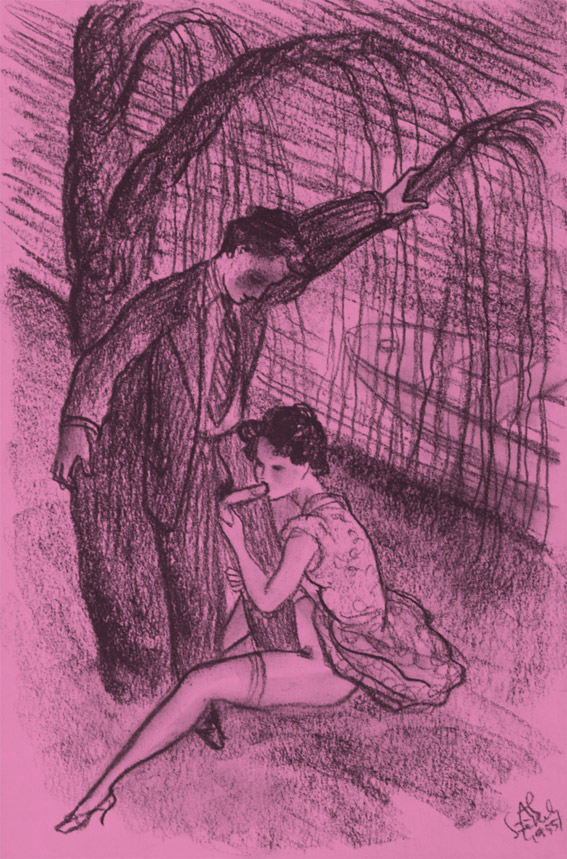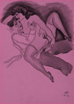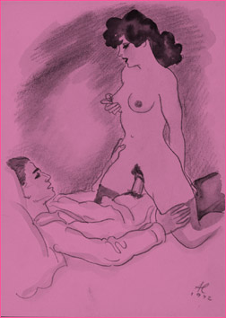 I just discovered Alex Székely and it was a love from the first sight. Pretty pornographic, often orgiastic, yet naive in some sense; ludic, lascivious and truly cute – that’s the kind of erotic art I definitely like 🙂 His erotic scenes are build in a manner of pornographic sequences, from five up to 15 images. The style varies slightly but most of the time it oscillates between simple drawing and a mix of it with aquarelle. One can find some “classic” themes, musical, party and park scenes but mostly just “bed time stories”. His humorous drawings are the ones I like the least. I could not find much background info about the man – the only thing that seems sure is the date of his birth: 1901 – I appreciate link to any data sources is someone was more lucky than me. Plenty of his drawings can be found at Kiesselbach Gallery & Auction House Site. I would love to acquire some to my collection but as far as I can see they are a bit to expensive for me :}