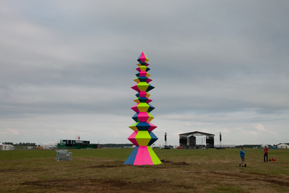 Realizowanie interwencji artystycznej w tej konkretnej sytuacji było/jest nie małym wyzwaniem. Projekt musi wytrzymać skalę wydarzenia – mam tu na myśli tak jego lokalizację: szczere pole pozbawione elementów architektonicznych do jakich można się odnieść w przestrzeni miejskiej, jak i ludzkie morze implikujące wizualny chaos i konieczność zagwarantowania maksymalnego bezpieczeństwa proponowanej instalacji. Jedno było dla mnie od początku oczywiste praca musi być efektowna i czytelna w sposób natychmiastowy – prezentowane równolegle koncerty nie zostawiają miejsca na nieśmiałość. Ponieważ festiwal odbywa się w momencie kiedy mamy polskie białe noce światło nie mogło być podstawowym elementem realizacji. Zdecydowałem się na kolor i obiekt.