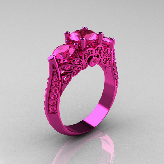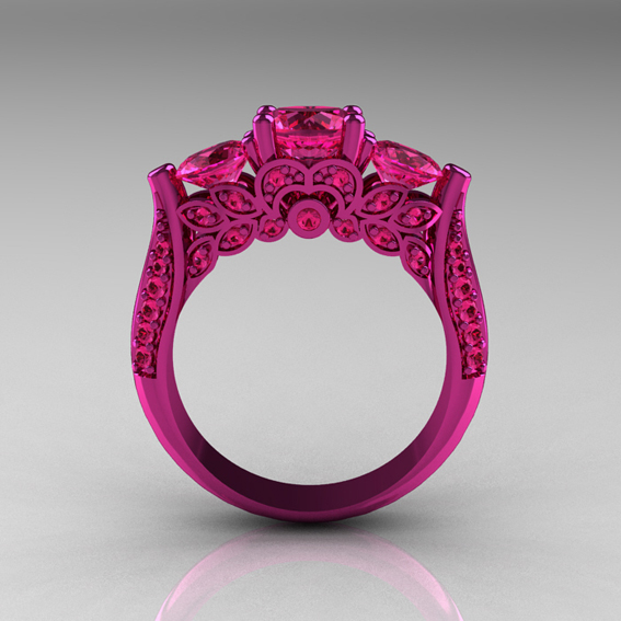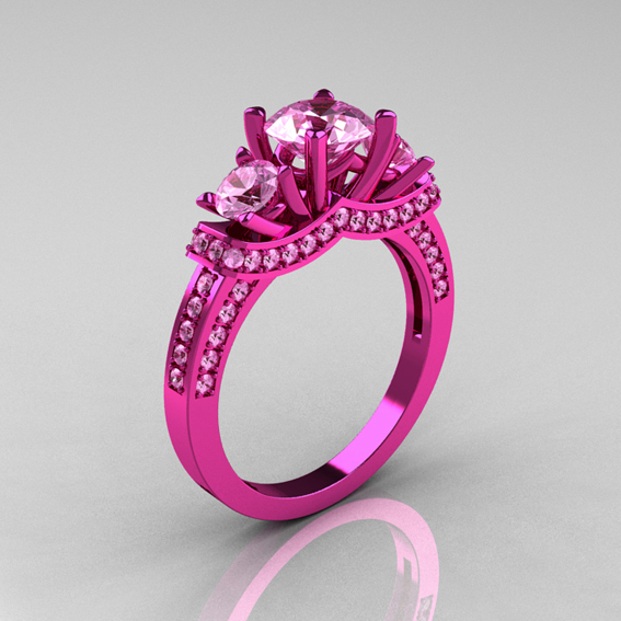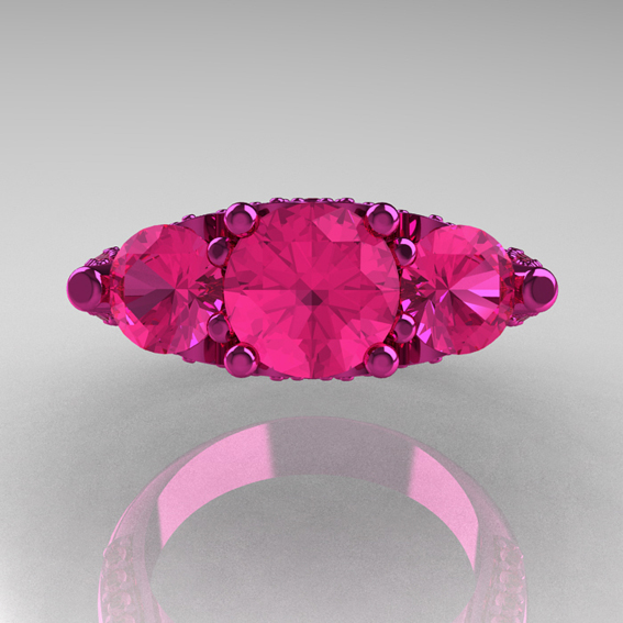 Classic 14K Pink Gold Three Stone Pink Sapphire Designer Solitaire Ring