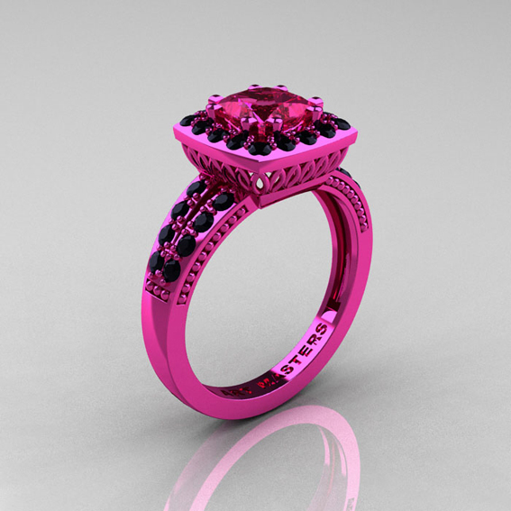 Renaissance Classic 14K Pink Gold 1.23 CT Princess Pink Sapphire Black Diamond Engagement Ring