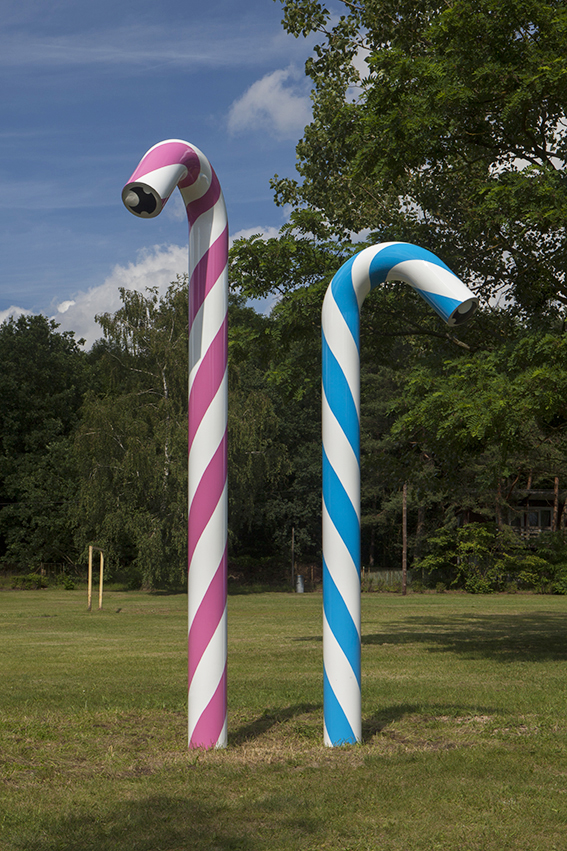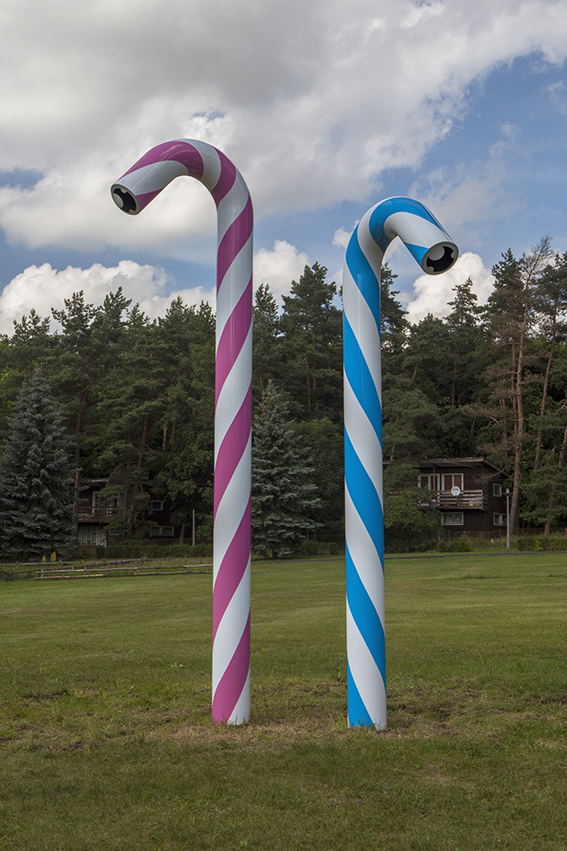 Dysponując takim kontekstem zdecydowałem się na wywołanie słodkich duchów – moja instalacja to zasadniczo dwa gigantyczne karmelki nawiązujące wprost do tradycyjnych, zanikających już, choć jeszcze istniejących na polskim rynku “prowincjonalnych”, “odpustowych” cukierków w kształcie wygiętych laseczek, używanych po dziś dzień do dekorowania bożonarodzeniowych drzewek. W tym wypadku interesowała mnie przeskalowana manifestacja słodkiej pokusy – postanowiłem zaimplantować do tego niby-raju dwóch gości z Candylandii – z rozkosznej a grzesznej krainy cukierniczych wybryków paralelnej do Paese dei balocchi do którego trafił Pinokio. Podobne fantazje dają się zresztą odnotować i we współczesnej popkulturze – wystarczy wspomieć choćby wizję Słodkiego Królestwa (Pora na przygodę, 2010) czy wirtualne przestrzenie “Mistrza Cukiernicy” (Ralph Demolka, 2012). Wszystkim wielbicielom waty cukrowej, bitej śmietany i wielopiętrowych deserów polecam też gorąco malarstwo malarstwo Willa Cottona, które również było dla mnie jedną z inspiracji. Powstałe obiekty to dwa specyficzne totemy-peryskopy, które obdarzone cyklopim okiem zyskują charakter bytów osobowych. Mam nadzieję, że będą dobrymi towarzyszami i zarazem obserwatorami wakacyjnych szaleństw a w bardziej ponurej aurze, która nieuchronnie spowije szarym woalem to miejsce, będą przypominać, że jeszcze wróci do nas Lato.