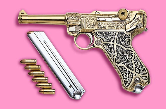 Accidentally in the relation to the bizarre, minimalist image of the facade of gun store in Mexico City that I posted in flicker I started to investigate Luger Parabellum and I found (posted below) case of golden pistol that seams to suit perfectly phantasmagoria of such uniform. As the thing come together I can only use this opportunity to mention that I published on my flicker Miguel Ventura’s statement related to his complex participation with pink swastikas on PND! Show. As for my reasons to incorporate this piece and my “United Antonyms” (corporative logos of SS and Red Cross united in pink presented as three dimensional plastic neon light boxes – read: blur in the fetish universe, corporation, idealism, promise of paradise, perfection etc.) you can found a bit more about it here. (Polish Only – Sorry – I have three months old baby boy and just can’t write in three languages about Nazi Horror Glam seduction potential all over again)