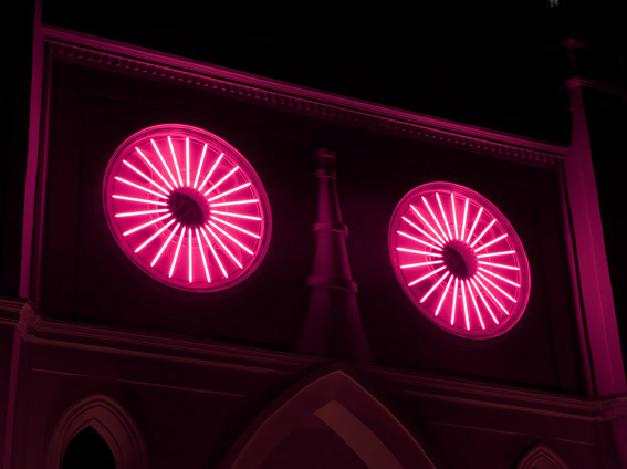 installation at the Lublin Castle facade. 48 pink fluorescent tubes.