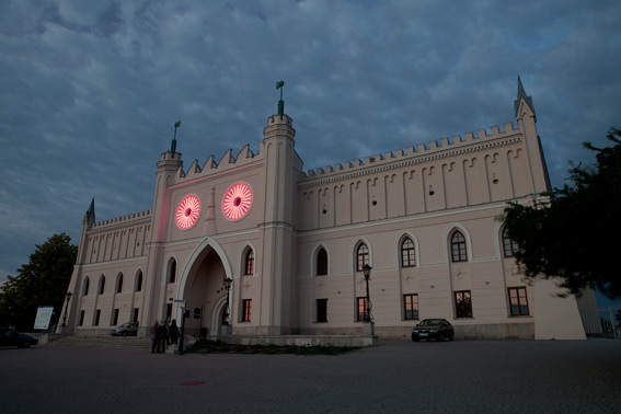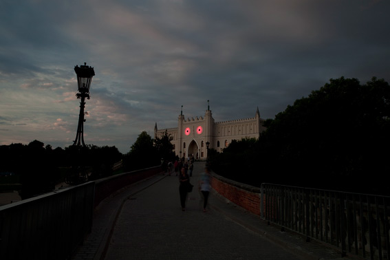 This time I would like to presume my recent pink ghost invocation: Phantom – installation over the facade of Lublin Castle. Soon after I was invited to work in Lublin I knew I want to do some light & jolly project there. Maybe because I went there in late November when the world goes into mourning, possibly because the shadow of Majdanek remains deep in my head. The history of the very castle is neither pink: it served as a prison for 123 years (1831 – 1954) – gallons of blood & tears were flushing its cobblestones. Yet there is something inevitably funny and grotesque in its anthropomorphic facade. Although the Italian architects are responsible for its design I sense some Mauritanian influence here. My work often consists in focusing points of attention. This piece can be considerate almost a ready-made. There was the face it had beige eyes and they were just asking for light. They are the mirrors of the soul, as we all know. So I decided to wake up the giant. Owl, demon – U name it. I could make it blue or green but I went pink for obvious reasons. I believe it proved pretty efficient. I’m happy, the first stage of my Tour de Pologne is concluded – soon the next moves 🙂