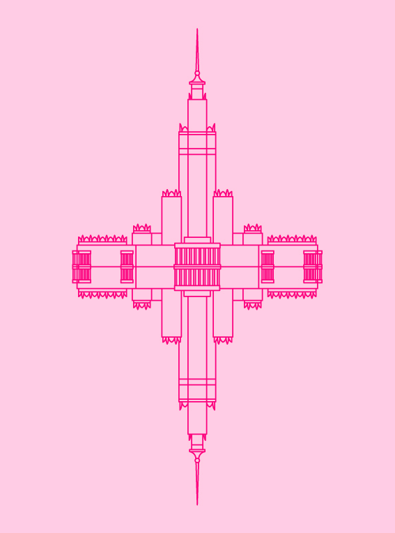 Zaproszony przez galerię LETO do udziału w kolejnym warszawskim projekcie od początku zadeklarowałem, że nie chcę aby była to jeszcze jedna realizacja oparta o edycję materiału z projektu W-wa. Na wystawie pojawia się mikroskopijny poliptyk wyjęty z albumu – krótka seria “warszawskich bruków” tym razem jednak jako kontrapunkt dla monumentalnej ikony powojennej Warszawy jaką jest Pałac Kultury i Nauki. Monolit Stalinizmu znienawidzony czy w najlepszym wypadku wyśmiany przez ludzi, których życie upłynęło w jego cieniu dla generacji dorastającej u schyłku socjalizmu osiągnął status kultowej ikony minionej epoki. Nietykalna, przytłaczająca manifestacja ideologii i systemu stała się dziś obiektem fascynacji czy wręcz sentymentalnych wzruszeń – historia po raz kolejny zmieniła swój kurs a wraz z nią nastąpiła nieuchronna konwersja percepcji i znaczeń. Proces absorbcji rzeczywistości przez fantazję intryguje mnie od dawna – wymuszone sakrum staje się profanum po przetopieniu go w popkulturalnym tyglu. Graficzna instalacja prezentowana w galerii LETO jest swoistą igraszką możliwą w oparciu o taką właśnie dynamikę. Imperializm komunistyczny ulega naturalnej fuzji z imperializmem Hoollywodzkim – milion ton betonu jest równie realne (czy nierealne) jak Gwiazda Śmierci z Gwiezdnych Wojen. Zastosowanie prostych zabiegów graficznych pozwala na konwersję Stalinowskiego Pałacu w Imperialny Krążownik Kosmiczny i jego integrację w pejzaż rodem z wczesnych gier komputerowych. Podobnie rzecz ma się z kolorem – czerwień państwowej grafiki zostaje zastąpiona intensywnym różem – minimalny ruch w skali braw staje się gestem w sposób banalny, a zasadniczy zmieniającym wymowę obrazu*. Omnipotencja systemu sprowadzona do poziomu zabawy, gry; oficjalna estetyka komu-klasycyzmu w zderzeniu z najbardziej “przyziemną” mikroarchitekturą biednego warszawskiego soc-modernizmu; to co oficjalne skonfrontowane z tym co marginalne – możemy dokonać indywidualnej ewaluacji wartości estetycznych – ocenić co z perspektywy czasu jawi się jako uniwersalne a co już w chwili swoich narodzin było absurdalnie anachroniczne – co zresztą nie umniejsza bynajmniej potencjału żadnego z tych estetyczno-symbolicznych zdarzeń. Świadkiem tego wszystkiego spersonifikowane Różowe Gówno – jeszcze jeden przykład ambiwalentości podmiotu: ekskrementu, brudu nobilitowanego do rangi ikony, maskotki, propozycji estetycznej czy wręcz “dzieła sztuki”.