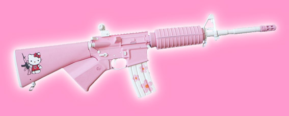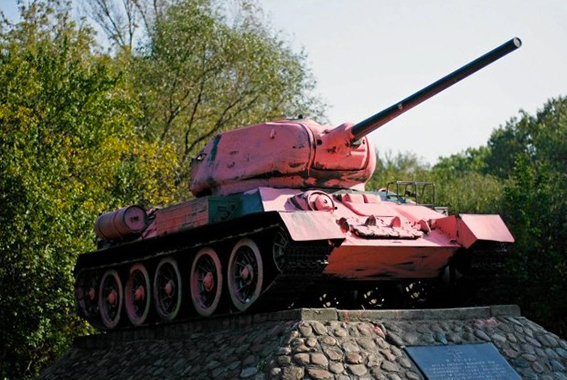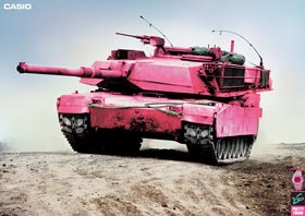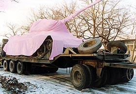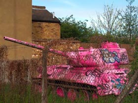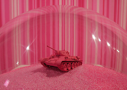 Różowych czołgów namnożyło nam się jak grzybów po deszczu. Najsłynniejszy to niewątpliwie realizacja czeskiego artysty Davida Cernego, który na wiosnę 1991 roku w Pradze pomalował na różowo jeden z typowych monumentów socjalistycznych – umieszczony na cokole czołg T-34. Akcja ta nabrała niespodziewanego wymiaru symbolicznego w momencie gdy czołg na przestrzeni bardzo krótkiego czasu najpierw został przemalowany przez wojsko na stadardowy kolor zgniłej zieleni a następnie po raz wtóry zaróżowił się pomalowany ponownie przez posłów do nowego demokratycznego parlamentu. Mniej więcej paralelnie (zimą 1991) artysta austriacki Marcus Geiger w ramach realizowanego w CSW projektu “Wealth of Nations” wykonał podobną (czołg został pokryty bladoróżowym frotem), choć o dużo mniejszym impakcie politycznym, akcję u wylotu Agrykoli w Warszawie. Czołg Cernego do dziś można oglądać w Muzeum Wojska i Techniki w Lesanach. Czeski artysta na dziesiąciolecie wydarzenie praskiego zrealizował kolejną akcje – fragment czołgu (zad) został zakopany na jednym z praskich trawników. W roku 2002 za malowanie czołgu na różowo wzięła się artystka polskiego pochodzenia Aleksandra Mir co wywołało szereg polemik w kontekście wcześniejszej pracy Cernego. W roku 2005 różowy czołg pojawił sie na manifestacjach Amnesty International. Wreszcie ostatnio na fali popularności różowych produktów (o tym niebawem) Casio użyło wizerunku różowego czołgu (również myśliwca, lotniskowca i łodzi podwodnej) w swojej kampanii reklamowej promującej nowy model różowego zegarka – Baby G. Ja sam miałem ochotę w 1998 na obszywanie czołgu różowym pluszem – uświadomiony przez Jacka Królaka, że podobna akcja miała już miejsce odłożyłem projekt do szafy aby zrealizować go ostatecznie w miniaturze przy okazji wystawy Pink Not Dead! ////// Los tanques rosas ya se multiplicaron como zetas después de la lluvia. El mas famoso es indudablemente la realización de artista checo David Cerny, quien en primavera 1991 en Praga pinto de color rosa uno de típicos monumentos socialistas – colocado en el pedestal tanque soviético T-34. La acción alcanzo inesperada dimensión simbólica cuando en un muy corto periodo de tiempo el tanque fue repintado primero a original color kaki por el ejercito y luengo de vuelta rosa por los diputados a nuevo parlamento democrático. Mas o menos paralelamente (en invierno de 1991) el artista austriaco Marcus Geiger como parte del proyecto “Wealth of Nations” (CCA Castillo Ujzadowski, Varsovia) realizo una acción parecida (el tanque fue cubierto con toalla rosa) aun de mucho menos impacto político. El tanque de Cerny hasta hoy día se puede ver en el Museo de Ejercito y Tecnología en Lesany. Una década después de su famosa acción el artista checo celebro su aniversario sepultando un fragmento de tanque (su culo de acero) en una jardinera en Praga. En el ano 2002 la artista neoyorquina de origen polaco Aleksandra Mir también decidió pintar tanque de color rosa lo que despertó variedad de polémicas debido al anterior pieza de Cerny. En el 2005 el tanque rosa apareció en las “Pride Parades” de Amnesty International. Finalmente debido a la creciente popularidad de productos rosas Casio utilizo la imagen de tanque rosa (y otras maquinas de guerra: avión de caza, portaaviones y submarino) en la campa?a publicitaria de su nuevo reloj rosa – Baby G. Yo mismo tenia ganas de cubrir una tanque de peluche rosa en 1998, cuando Jacek Krolak me contó que ya se ha hecho un proyecto parecido deje la idea para recuperarla en miniatura en la ocasión de la exposición Pink Not Dead! ////// Pink tanks multiply like mushrooms after the rain. The most famous undoubtedly is one done by check artist David Cerny who in spring 1991 in Prague painted pink one of typical socialist “war-pride” monuments – soviet T-34 tank on pedestal. The action reach surprising symbolical dimension when the tank was repainted several times during very short period of time: first the army painted it back to khaki then the deputies to new democratic parliament painted it pink again. More or less at the same time (winter 1991) Austrian artist Marcus Geiger did sort of similar (but without such political impact) action as a part of “Wealth of Nations” exhibition at CCA, Ujzadowski Castle in Warsaw. (The tank was placed at Agrykola Street near the museum and covered with pink towel cloth.) The Cerny’s tank can be seen until today at Army and Technology Museum in Lesany. Decade later check artist decided to celebrate the 10th anniversary of the project by burring part of the tank (its iron ass) in one of the green zones of Prague. In 2002 the New York based polish artist Aleksandra Mir decided to paint another tank in pink, the project aroused many polemic because of the previous Cerny’s piece. In 2005 a pink tank participated in Amnesty International?s “Pride Parades”. Finally in reaction of growing popularity of pink products Casio decided to use the image of Pink Tank (and others war machines: jet fighter, air carrier, submarine) in itsadvertising campaign for the new pink Baby G watch. As for myself in 1998 I had the idea of covering a tank with pink synthetic fur but once Jacek Krolak told me that a similar project was already done I put it on the side until Pink Not Dead! exhibition where I presented it as a miniature diorama.